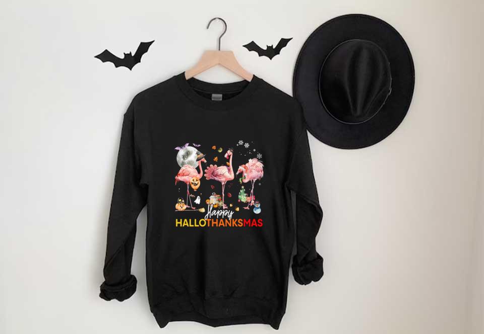 Flamingo Witch Santa Claus Christmas Shirt, Flamingo Happy Hallothanksmas Shirt