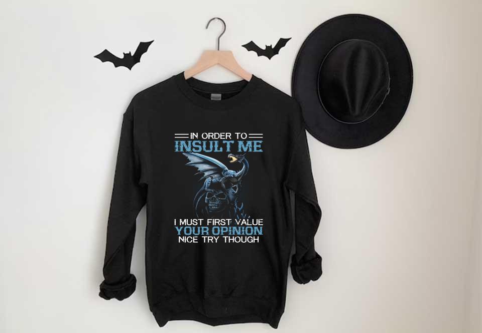 I Must Firt Value Your Opinion Nice Try Though Shirt, Dragon On Skull In Order To Insult Shirt is an awesome shirt about topic Trending: Dragon that our team designed for you. LIMITED EDITION with many styles as a hoodie, long-sleeve tee, v-neck, tank-top, sweater, youth tee, sweat shirt. This shirt has different color and size, click button bellow to grab it.